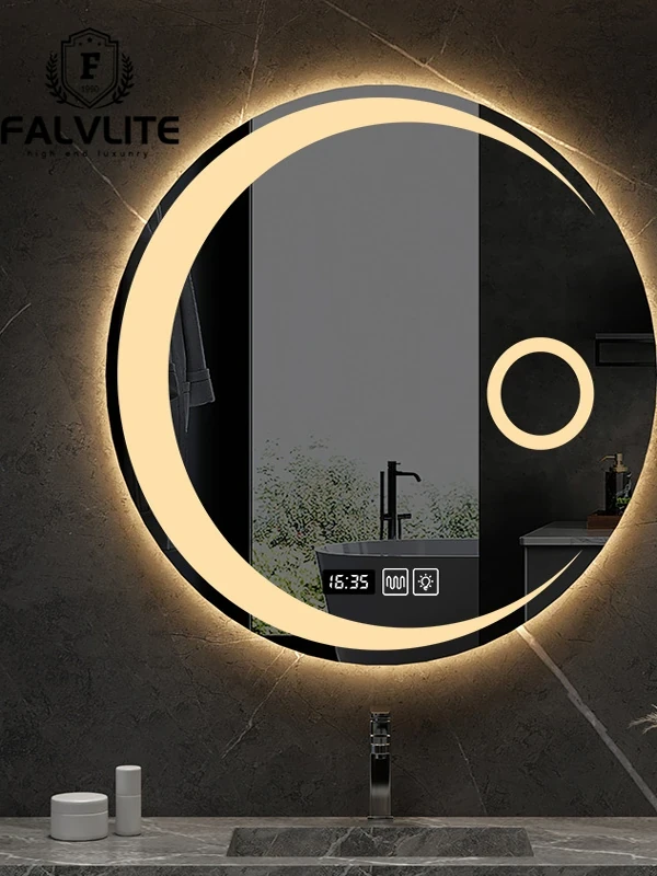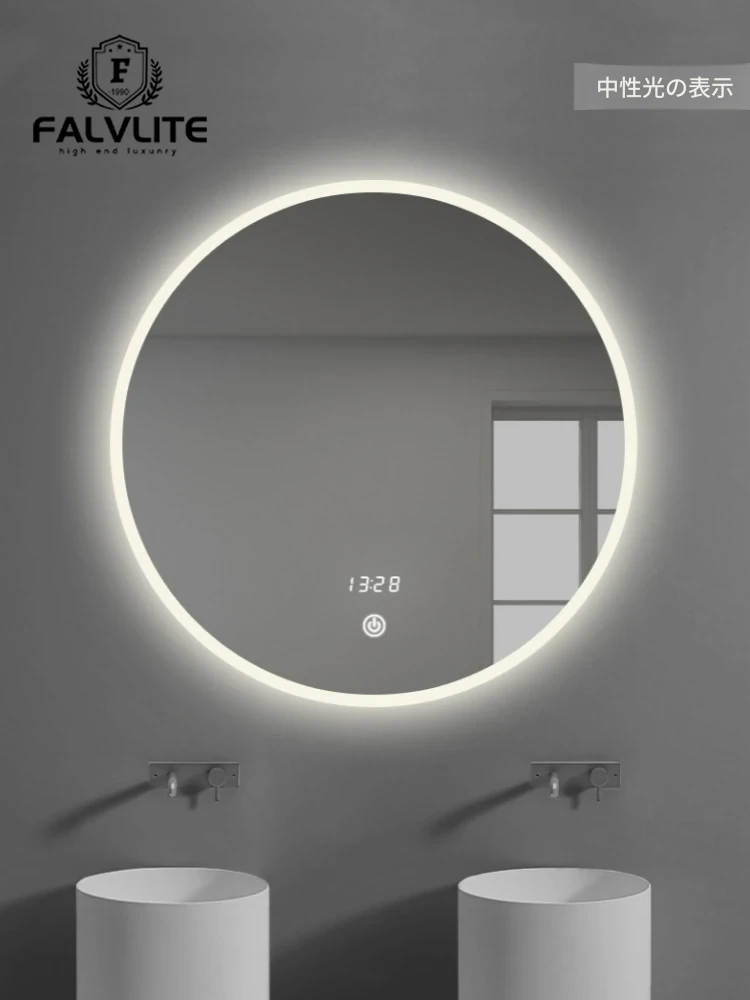 FALVLITスマートバスルームミラー - 触れられるLEDライト付きの丸型防曇壁掛け鏡!高精細映像で、毎日の美容ルーチンを格上げ。高品質なデザインで、あなたのバスルームをスタイリッシュに演出します!
