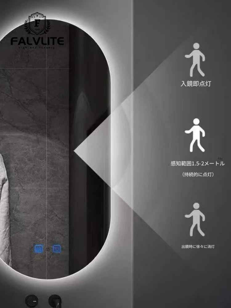 FALVLITEスマートバスルームミラー LEDライト付き 壁掛け式 防曇トイレ鏡 洗面所・バスルームに最適!美しい反射でお手入れ簡単、毎日のスキンケアをサポートします。