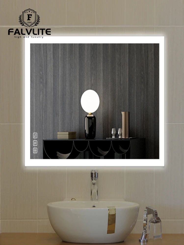 FALVLITE四角直角型内発光スマートミラー - バスルーム用LED壁掛け化粧鏡、タッチスクリーンで美しさを引き出す!あなたのメイクアップ体験を格上げする理想的なアイテム!
