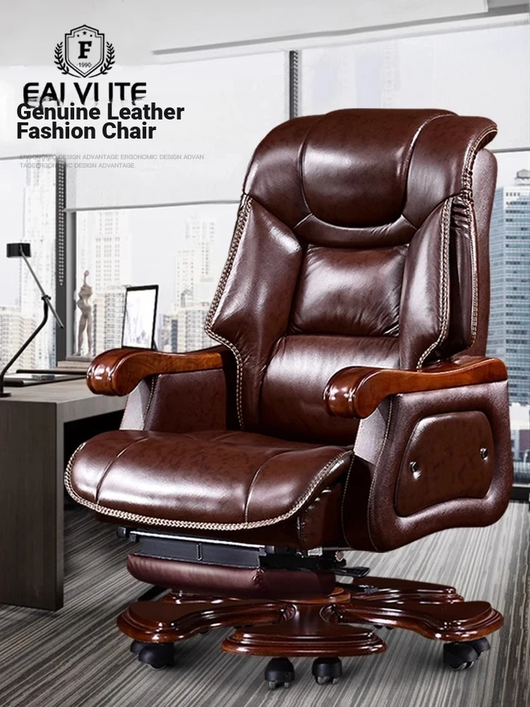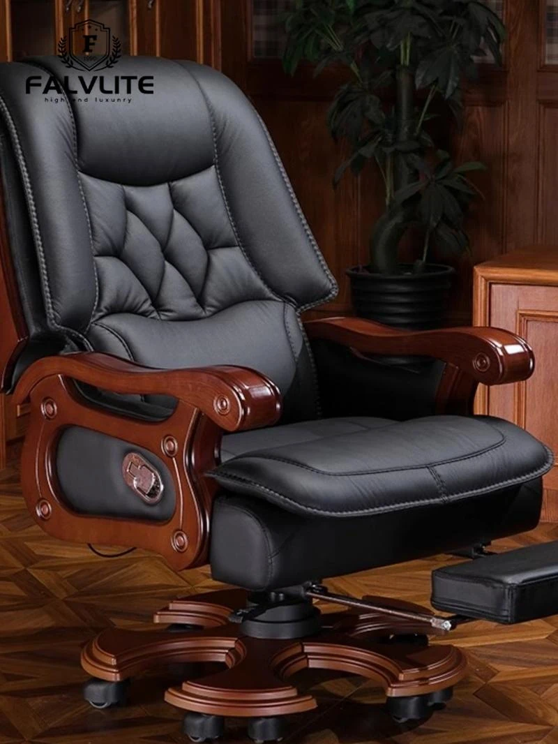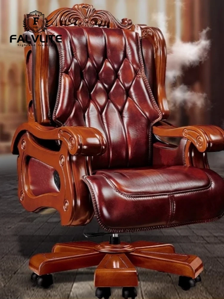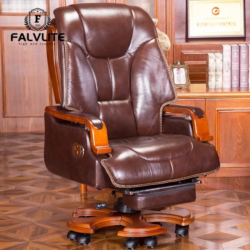 FALVLITE Genuine Leather Executive Office Chair with Adjustable Height, Solid Wood Frame, Massage Function, and Reclining Feature - Luxurious Cowhide Boss Chair for Ultimate Comfort and Style
