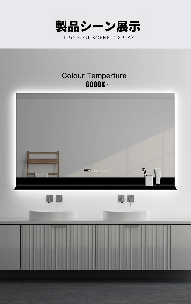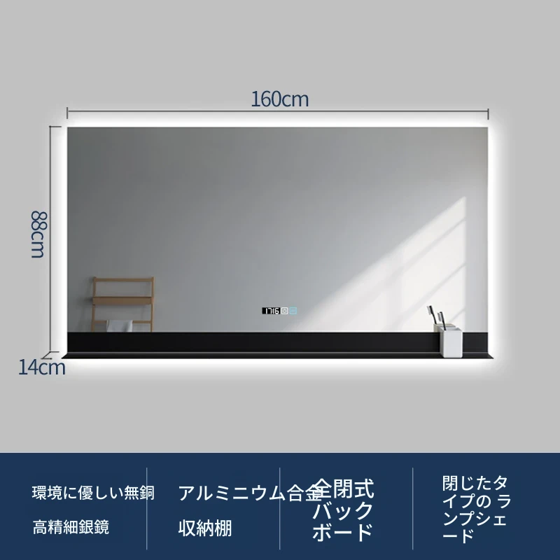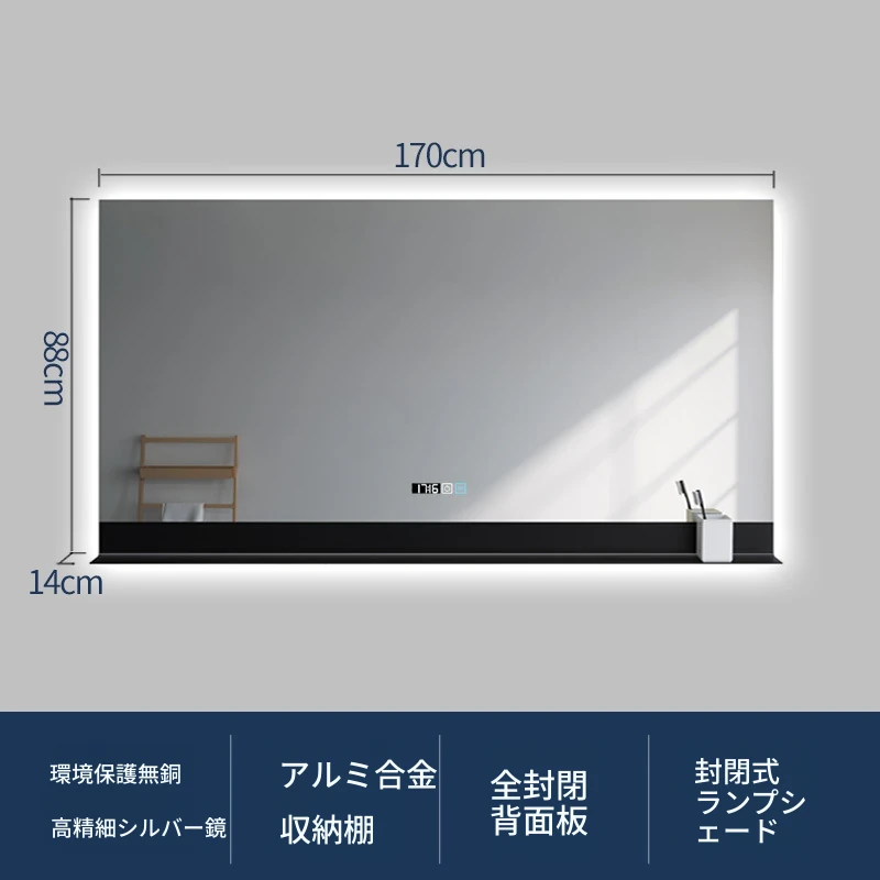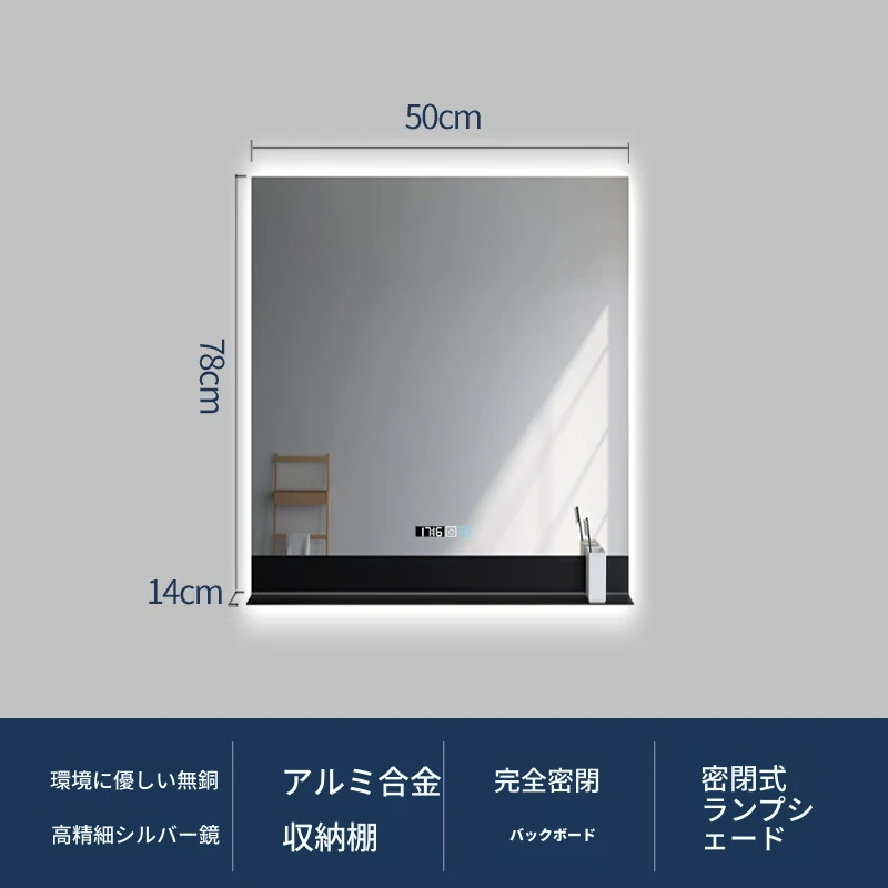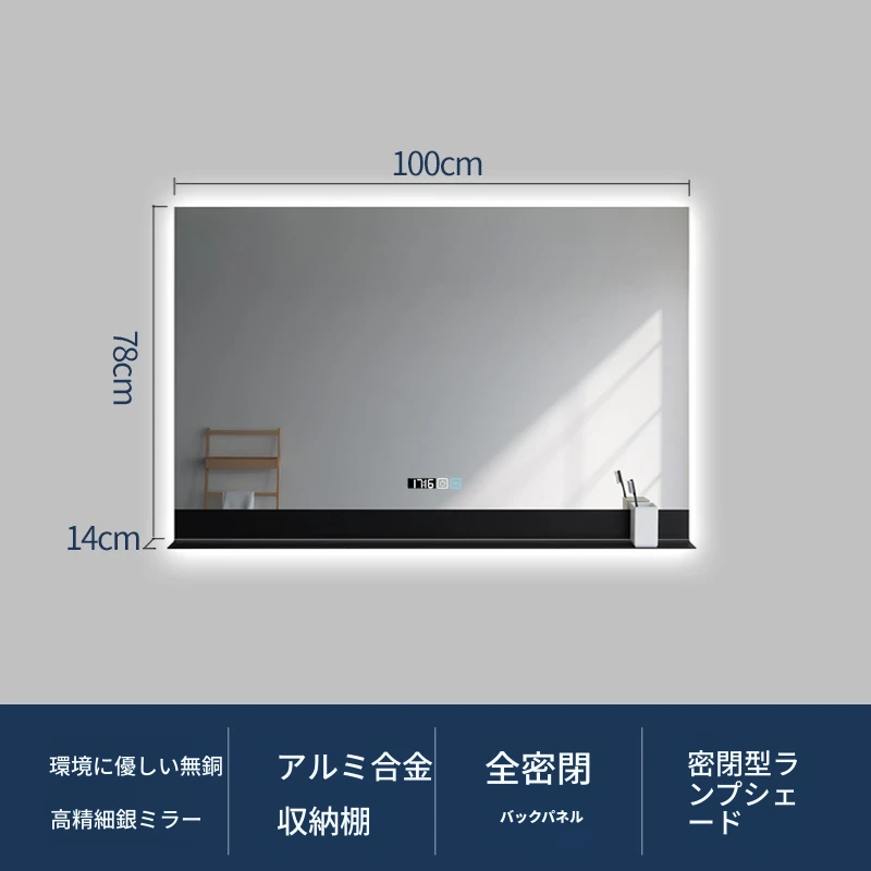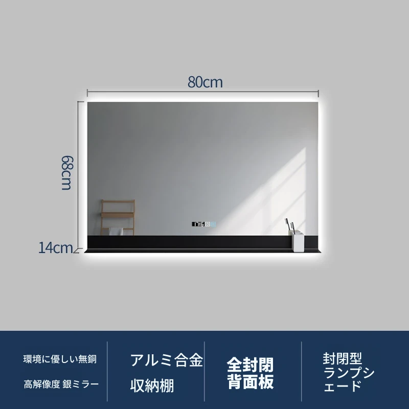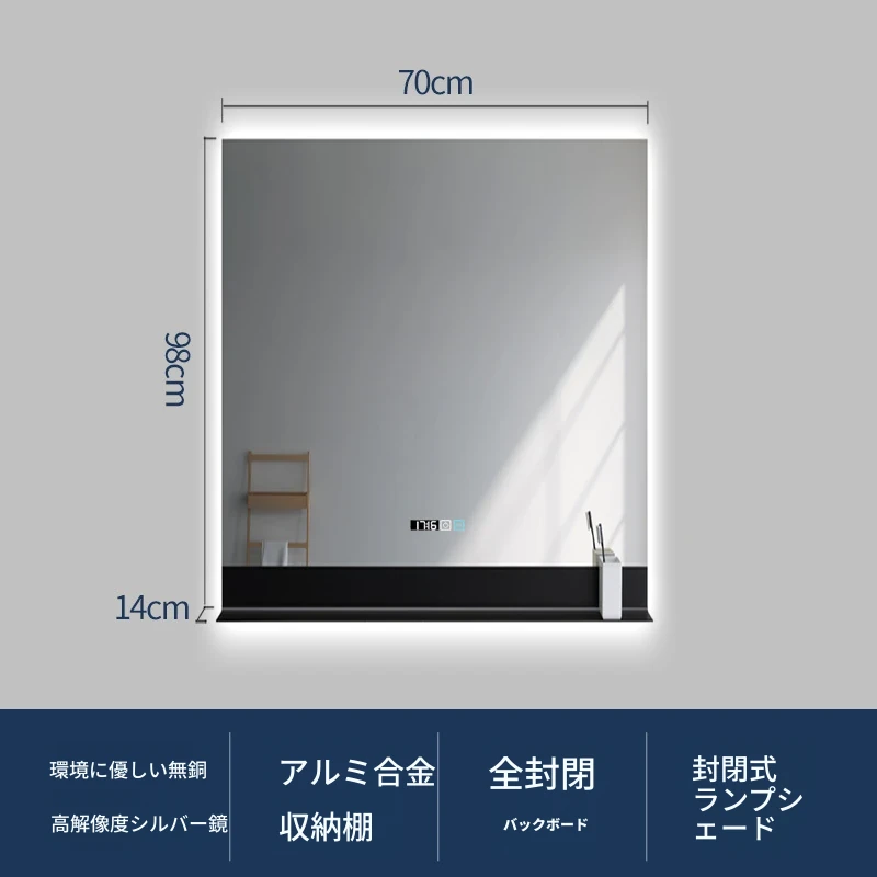 FALVLIT バスルームミラー - おしゃれなブラック&ゴールドデザイン、調光可能なLED照明付き、便利な収納ラック付きで、霧除け機能も完備!快適なメイクアップタイムを実現!