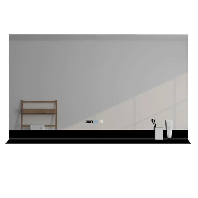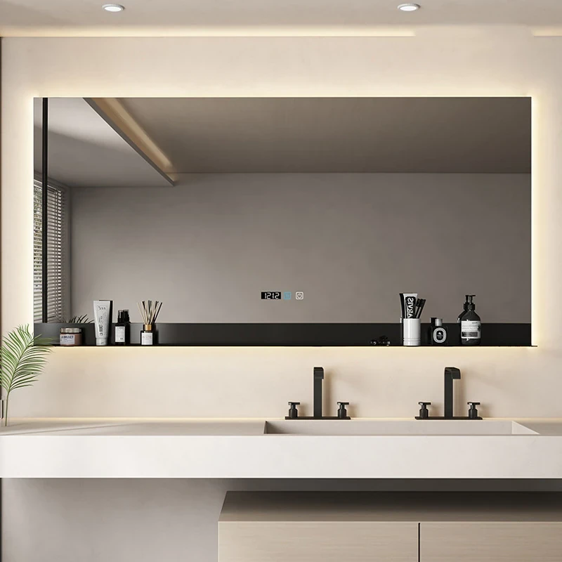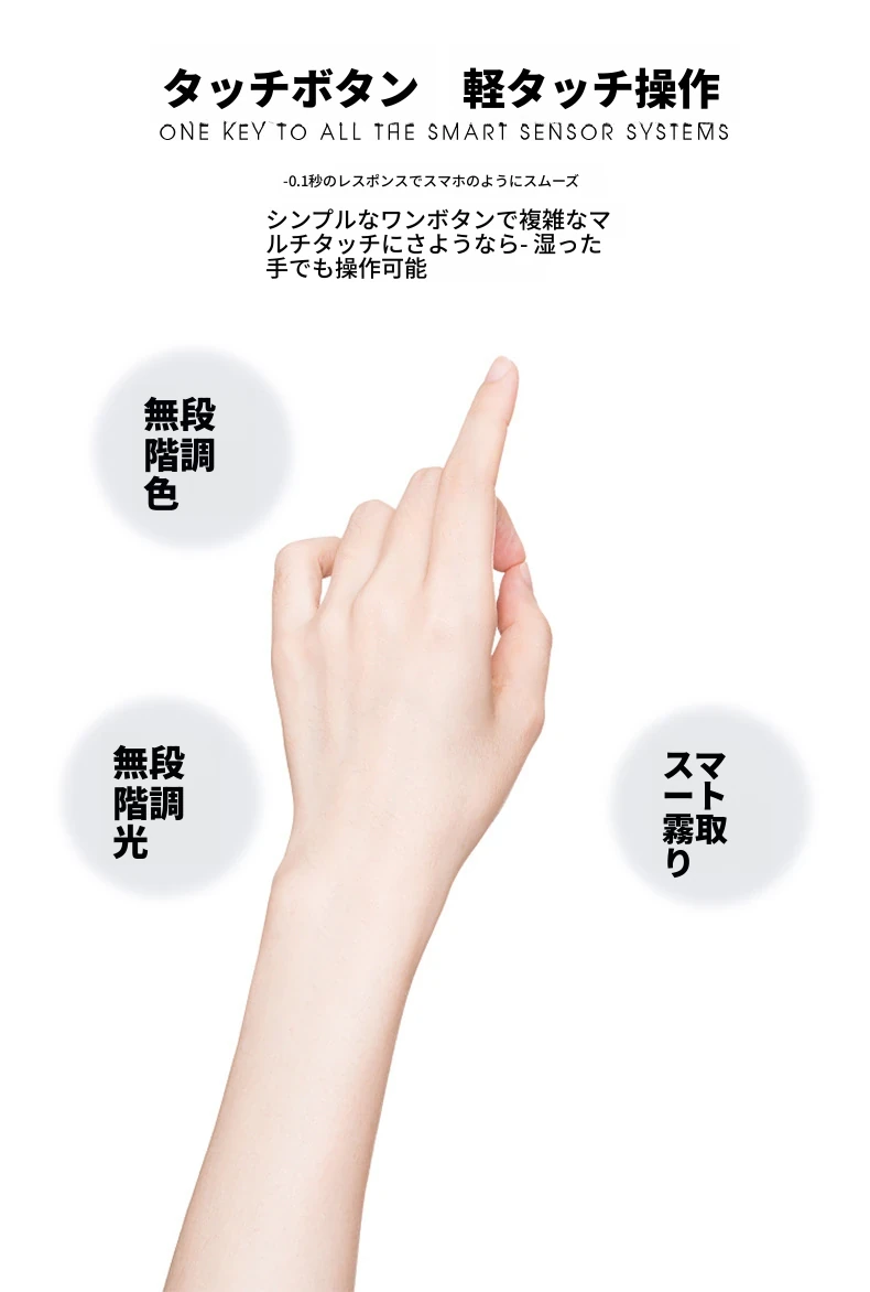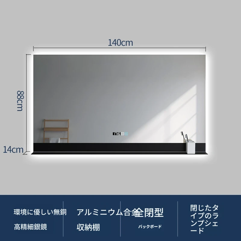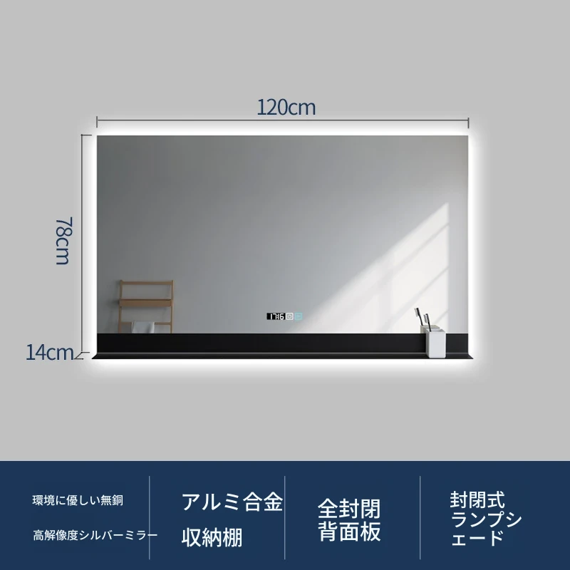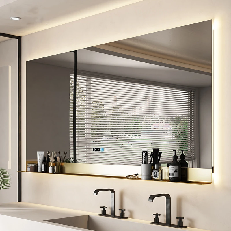 FALVLIT バスルームミラー - おしゃれなブラック&ゴールドデザイン、調光可能なLED照明付き、便利な収納ラック付きで、霧除け機能も完備!快適なメイクアップタイムを実現!