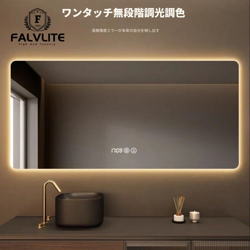 FALVLITEスマートLED防霧バスルームミラー|タッチスクリーン付きの照明ミラー|壁掛けタイプで、毎日の洗面が快適に!湿気の多いバスルームでもクリアな視界を実現。おしゃれなデザインで、インテリアにも最適です!