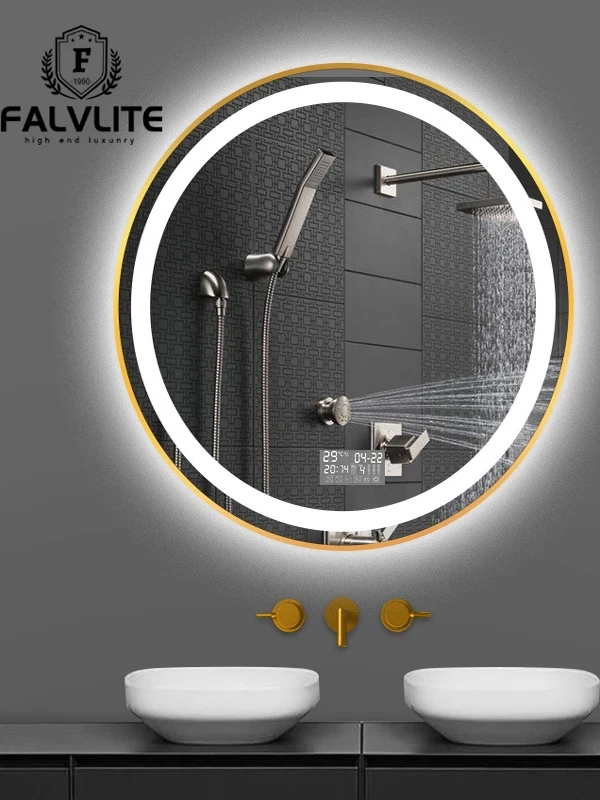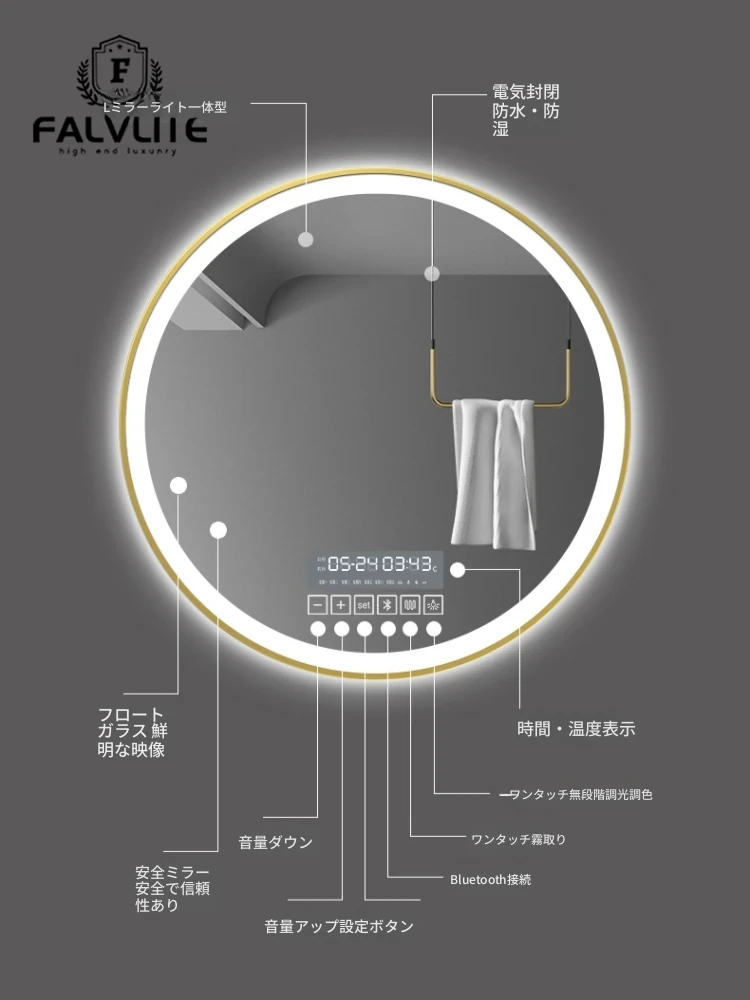 FALVLITEスマートバスルームミラー - 防曇・LED照明付き壁掛け洗面化粧鏡!美しさを引き立てる光の円形デザインで、毎朝のルーティンを特別に。お手入れも簡単で、快適なバスタイムをサポートします!