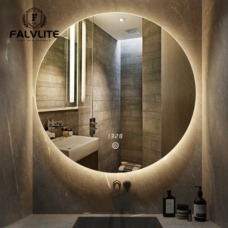 FALVLITE壁掛けスマートタッチスクリーン浴室用LED防霧ミラー - 美しさを引き立てる円形メイクアップミラーで、洗面所をスタイリッシュに演出!