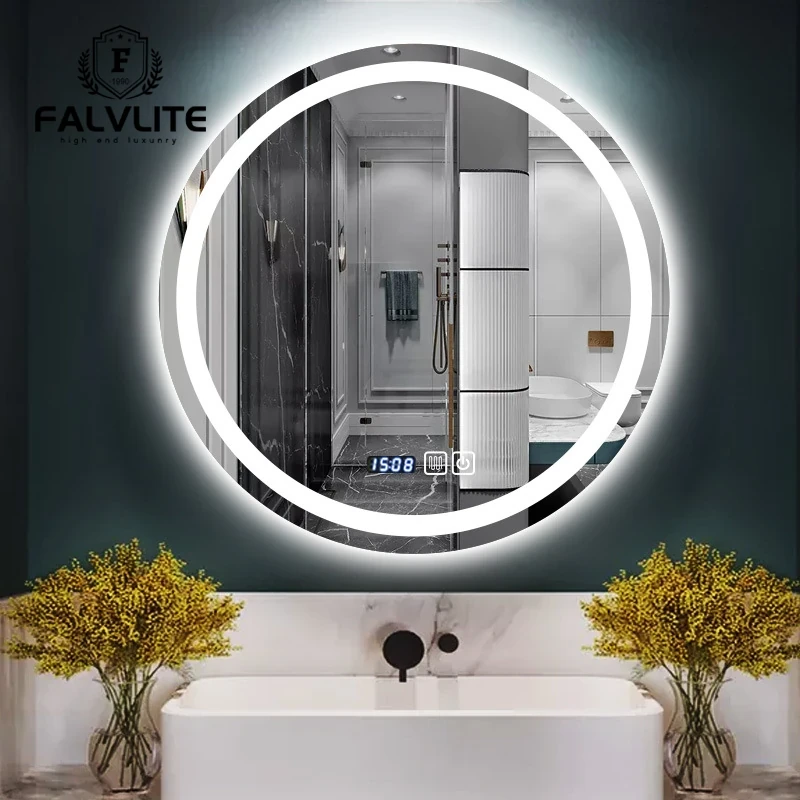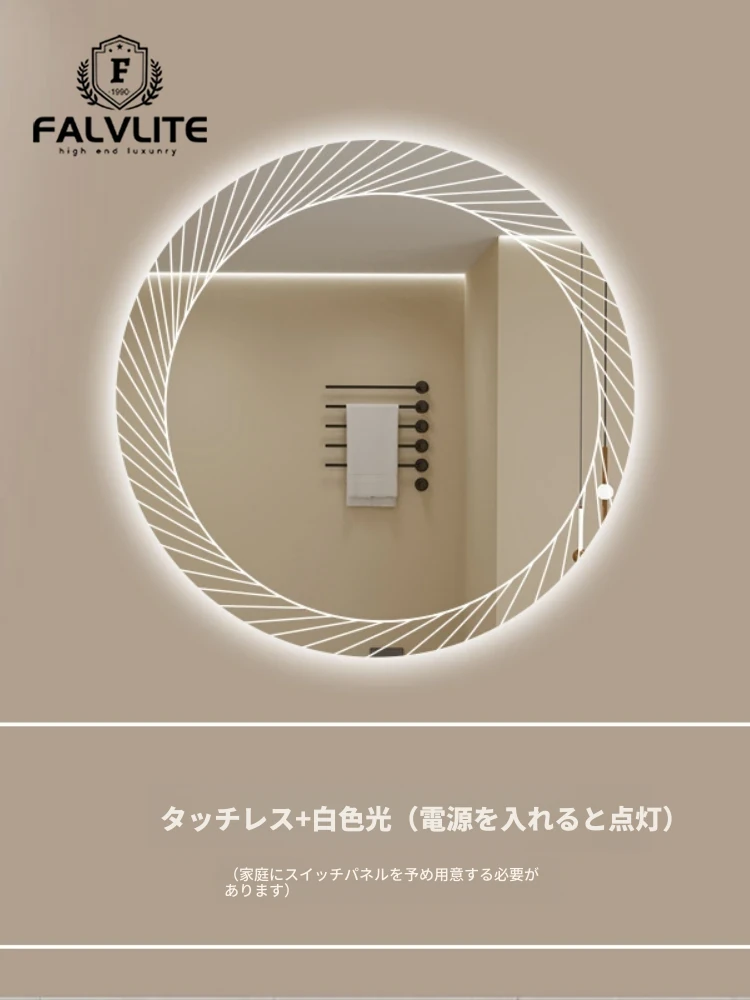 FALVLITE スマートタッチミラー - LEDライト付きの円形鏡、浴室やトイレに最適!防曇機能でクリアな映像を保ち、家庭やホテルでの使用にぴったりです。